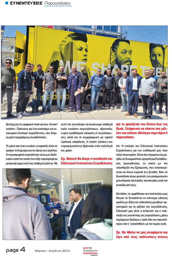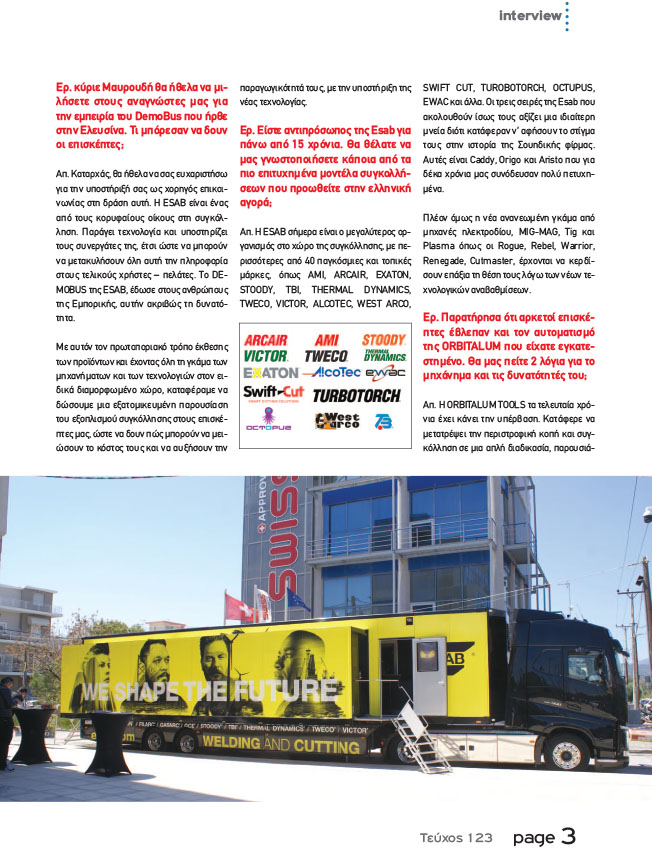 Απ. Καταρχάς, θα ήθελα να σας ευχαριστήσω για την υποστήριξή σας ως χορηγός επικοινωνίας στη δράση αυτή. Η ESAB είναι ένας από τους κορυφαίους οίκους στη συγκόλληση. Παράγει τεχνολογία και υποστηρίζει τους συνεργάτες της, έτσι ώστε να μπορούν να μετακυλήσουν όλη αυτή την πληροφορία στους τελικούς χρήστες – πελάτες. Το DEMOBUS της ESAB, έδωσε στους ανθρώπους της Εμπορικής, αυτήν ακριβώς τη δυνατότητα. Με αυτόν τον πρωτοποριακό τρόπο έκθεσης των προϊόντων και έχοντας όλη τη γκάμα των μηχανήματων και των τεχνολογιών στον ειδικά διαμορφωμένο χώρο, καταφέραμε να δώσουμε μια εξατομικευμένη παρουσίαση του εξοπλισμού συγκόλλησης στους επισκέπτες μας, ώστε να δουν πώς μπορούν να μειώσουν το κόστος τους και να αυξήσουν την παραγωγικότητά τους, με την υποστήριξη της νέας τεχνολογίας.