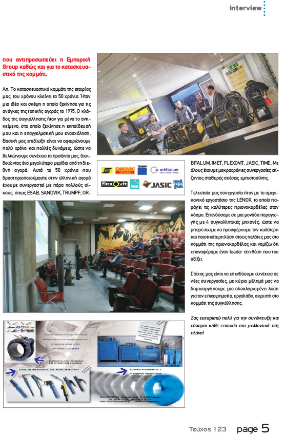 Απ. Το κατασκευαστικό κομμάτι της εταιρίας μας, του χρόνου κλείνει τα 50 χρόνια. Ήταν μια ιδέα και σκέψη η οποία ξεκίνησε για τις ανάγκες της τοπικής αγοράς το 1975. Ο κλάδος της συγκόλλησης ήταν για μένα το αντικείμενο, στο οποίο ξεκίνησε η εκπαίδευσή μου και η επαγγελματική μου ενασχόληση. Βασική μας επιδίωξη είναι να αφιερώνουμε πολύ χρόνο και πολλές δυνάμεις, ώστε να βελτιώνουμε συνέχεια τα προϊόντα μας, διεκδικώντας ένα μεγαλύτερο μερίδιο από τη διεθνή αγορά. Αυτά τα 50 χρόνια που δραστηριοποιούμαστε στην ελληνική αγορά έχουμε συνεργαστεί με πάρα πολλούς οίκους, όπως ESAB, SANDVIK, TRUMPF, ORBITALUM, ΙΜΕΤ, FLEXOVIT, JASIC, TIME. Με όλους έχουμε μακροχρόνιες συνεργασίες χτίζοντας σταθερές σχέσεις εμπιστοσύνης. Τελευταία μας συνεργασία ήταν με το αμερικανικό εργοστάσιο της LENOX, το οποίο παράγει τις καλύτερες πριονοκορδέλες στον κόσμο. Επενδύσαμε σε μια μονάδα παραγωγής με 4 συγκολλητικές μηχανές, ώστε να μπορέσουμε να προσφέρουμε την καλύτερη και ποιοτικότερη λύση στους πελάτες μας στο κομμάτι της πριονοκορδέλας και νομίζω ότι επαναφέραμε έναν leader στη θέση που του αξίζει. Στόχος μας είναι να επενδύουμε συνέχεια σε νέες συνεργασίες, με κύριο μέλημά μας να δημιουργήσουμε μια ολοκληρωμένη λύση για τον επιχειρηματία, εργολάβο, χειριστή στο κομμάτι της συγκόλλησης.